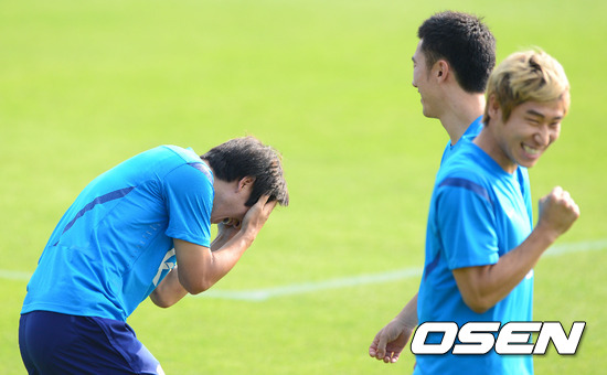 이근호가 박주호와 패스 훈련을 주고 받다 박주호가 실수를 하자 벌칙으로 꿀밤을 때리곤 즐거워하고 있다.