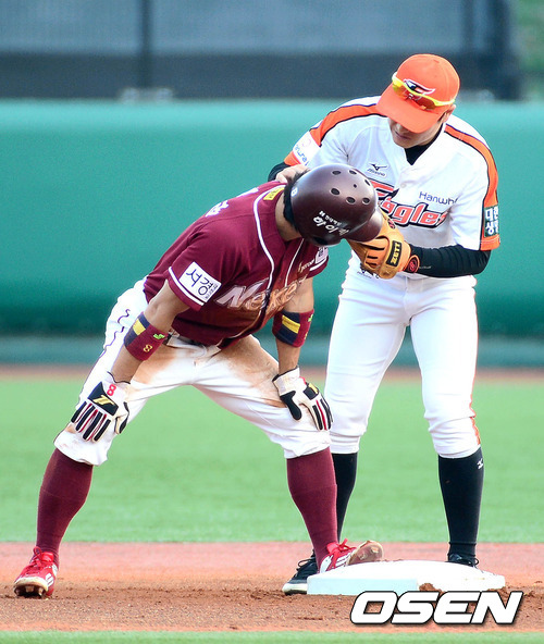 10일 오후 대전 한밭야구장에서 열린 '2012 팔도 프로야구' 한화 이글스와 넥센 히어로즈의 경기, 1회초 1사 1루 한화 이대수가 넥센 유한준 타석때 도루에 성공한 1루주자 정수성의 흙먼지를 털어주고 있다.