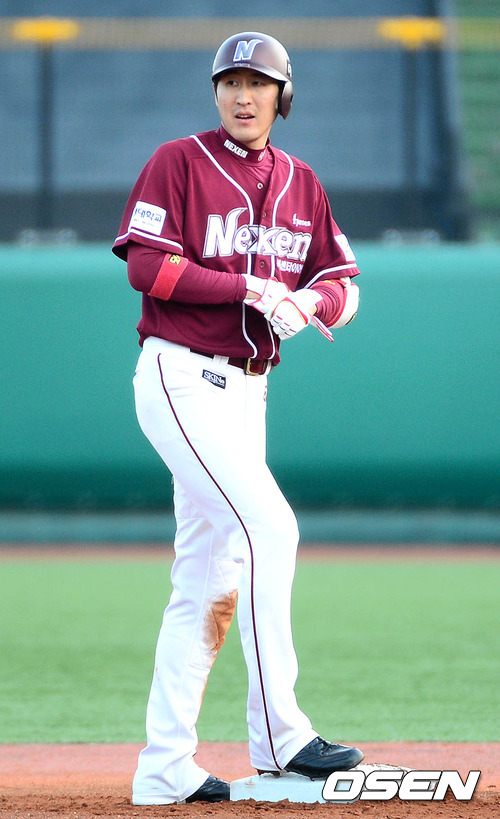 10일 오후 대전 한밭야구장에서 열린 '2012 팔도 프로야구' 한화 이글스와 넥센 히어로즈의 경기, 1회초 1사 1루 넥센 유한준이 좌중간 1타점 선제 적시타를 치고 2루에서 세이프 되고 있다.