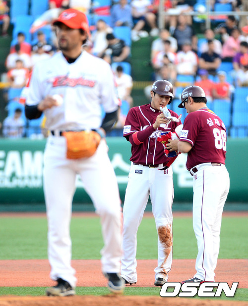 10일 오후 대전 한밭야구장에서 열린 '2012 팔도 프로야구' 한화 이글스와 넥센 히어로즈의 경기, 1회초 1사 1루 넥센 유한준이 좌중간 1타점 선제 적시타를 치고 심재학 코치에게 팔꿈치 보호대를 넘겨주고 있다.