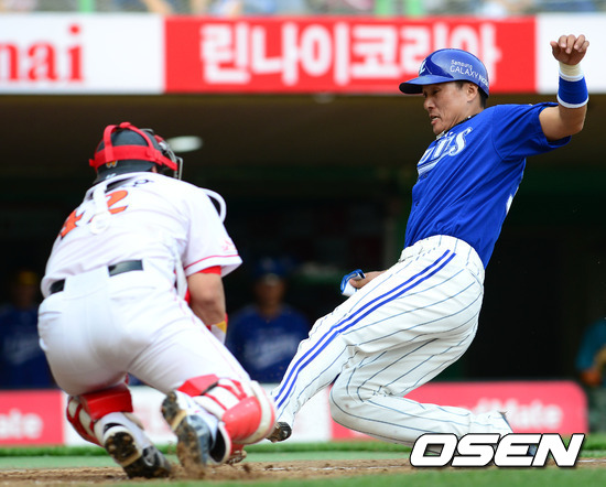 9일 오후 인천 문학구장에서 열린 '2012 팔도 프로야구' SK 와이번스와 삼성 라이온즈의 경기, 4회초 1사 만루 삼성 손주인의 희생 플라이로 3루 주자 이승엽이 홈으로 슬라이딩 득점을 올리고 있다.