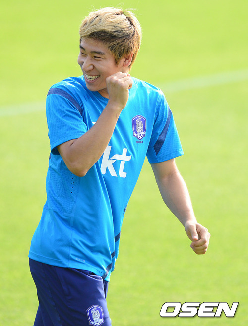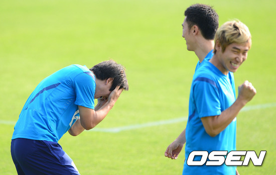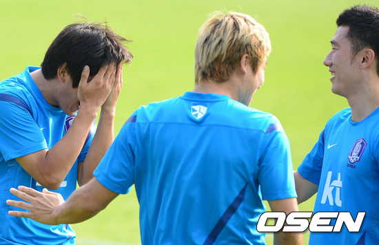 이근호가 박주호와 패스 훈련을 주고 받다 박주호가 실수를 하자 벌칙으로 꿀밤을 때리곤 즐거워하고 있다.