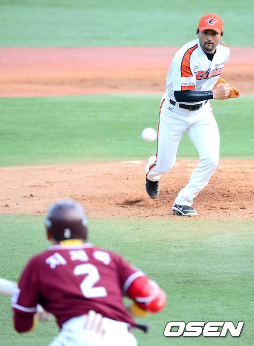 10일 오후 대전 한밭야구장에서 열린 '2012 팔도 프로야구' 한화 이글스와 넥센 히어로즈의 경기, 2회초 1사 1루 한화 선발 박찬호가 넥센 지재욱의 번트 타구를 잡으려 달리고 있다.