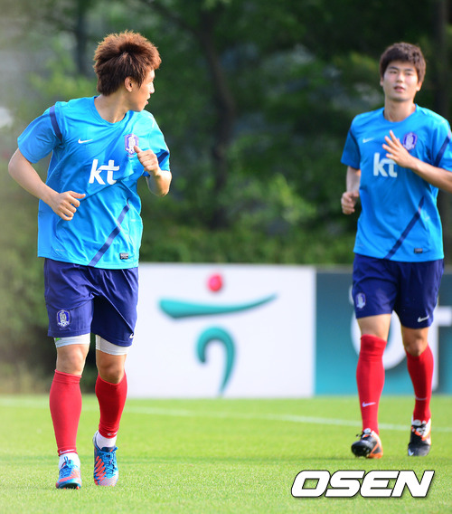 기성용이 앞에서 러닝을 하던 구자철을 향해 볼을 차서 맞추고는 모른척 하고 있다.