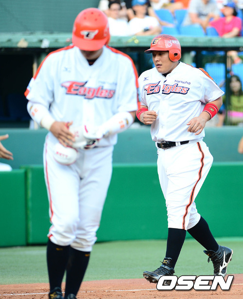 10일 오후 대전 한밭야구장에서 열린 '2012 팔도 프로야구' 한화 이글스와 넥센 히어로즈의 경기, 4회말 2사 만루 한화 신경현의 밀어내기 볼넷때 3루주자 김태균이 홈을 밟고 있다.