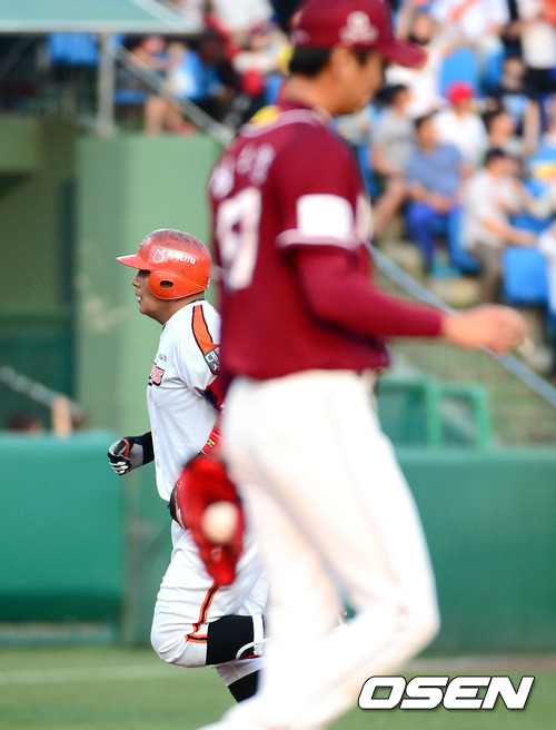 10일 오후 대전 한밭야구장에서 열린 '2012 팔도 프로야구' 한화 이글스와 넥센 히어로즈의 경기, 5회말 1사 한화 김태균이 좌전 솔로 홈런을 날리고 그라운드를 돌고 있다.
