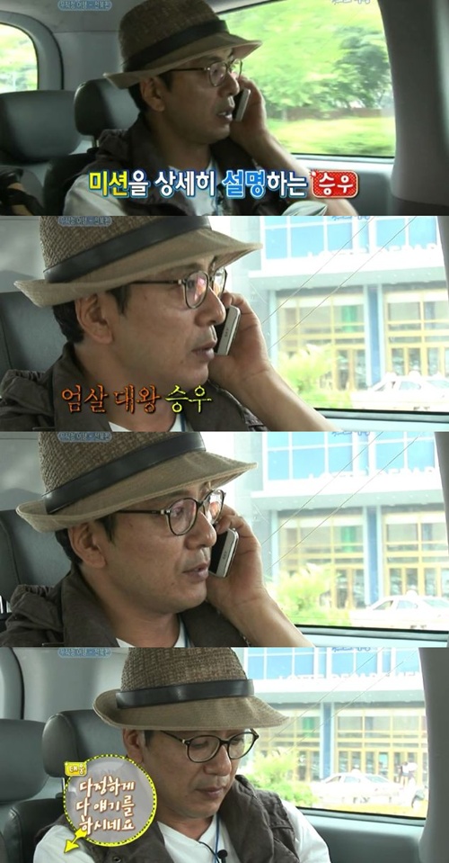 이날 김승우는 엄태웅과 함께 '도보여행' 미션에 당첨, 미션 완료 전까지 서 있거나 걷기만 해야하는 임무를 맡았다. 이어 김승우는 목적지로 이동 중 걸려온 김남주의 전화에 자신의 임무, 미션의 내용, 멤버들의 행적까지 모두 조근조근 설명하는 모습을 보였다.