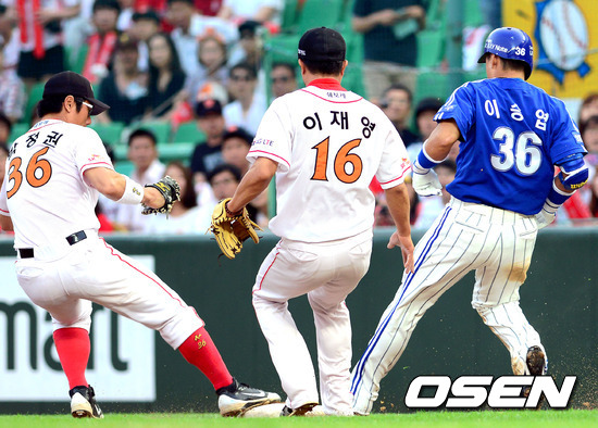 9일 오후 인천 문학구장에서 열린 '2012 팔도 프로야구' SK 와이번스와 삼성 라이온즈의 경기, 7회초 2사 1,2루 삼성 이승엽이 내야 땅볼을 치고 1루에서 아웃 당하고 있다.