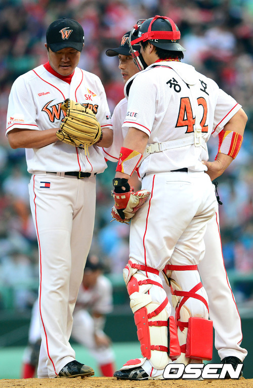 9일 오후 인천 문학구장에서 열린 '2012 팔도 프로야구' SK 와이번스와 삼성 라이온즈의 경기, 7회초 2사 1,2루 Sk 성준 코치가 삼성 이승엽의 타석에 앞서 마운드에 올라 이재영을 격려하고 있다.