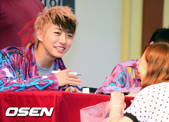 10일 오후 용산 아이파크 이벤트홀에서 진행된 아이돌 그룹 'B.A.P 팬 사인회'에서 B.A.P 멤버 방용국이 팬과 이야기를 나누며 사인을 하고 있다.