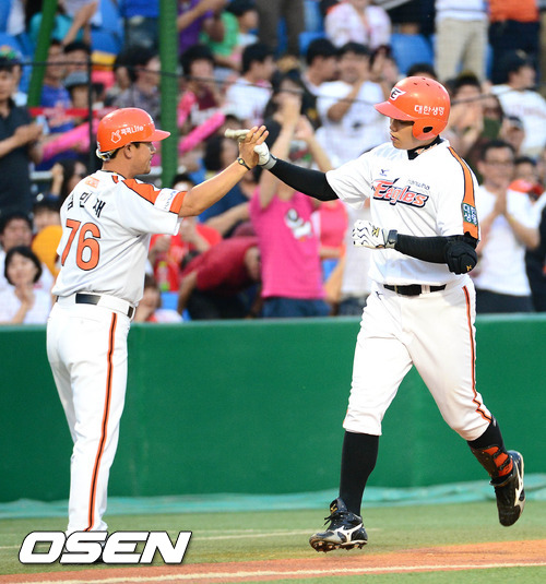 10일 오후 대전 한밭야구장에서 열린 '2012 팔도 프로야구' 한화 이글스와 넥센 히어로즈의 경기, 7회말 1사 1,3루 한화 최진행이 좌중월 스리런 홈런을 치고 김민재 코치와 하이파이브를 하고 있다.