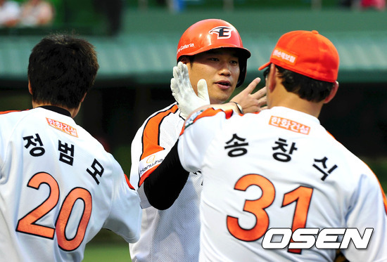 10일 오후 대전 한밭야구장에서 열린 '2012 팔도 프로야구' 한화 이글스와 넥센 히어로즈의 경기, 7회말 1사 1,3루 한화 최진행이 좌중월 스리런 홈런을 치고 더그아웃에서 동료들의 축하를 받고 있다.