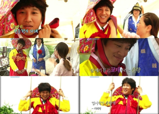 이날 춘향 마을을 체험하기 위해 방문한 차태현과 성시경은 먼저 춘향과 도령으로 변신했다. 먼저 성시경이 춘향의 의상을 입으려 했지만, '거구'답게 옷이 맞지 않았다. 이에 차태현이 대신 춘향의 의상을 입게된 것.