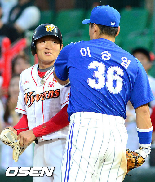 9일 오후 인천 문학구장에서 열린 '2012 팔도 프로야구' SK 와이번스와 삼성 라이온즈의 경기, 8회말 무사 삼성 이승엽이 SK 김재현의 호수비를 칭찬해주고 있다.