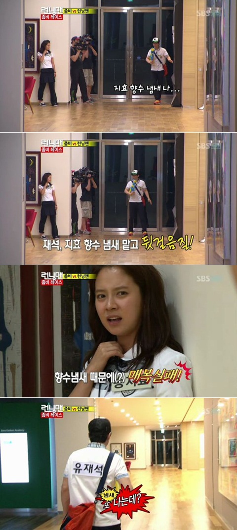 유재석은 송지효와 가까워지자 "지효 향수 냄새다. 지효 향수 냄새가 너무 난다"고 말해 송지효를 당황케 했다. 이내 유재석은 또 다른 장소에 매복해 있던 송지효의 향수 냄새를 맡고 "향수 냄새가 또 난다"고 말해 웃음을 자아냈다.