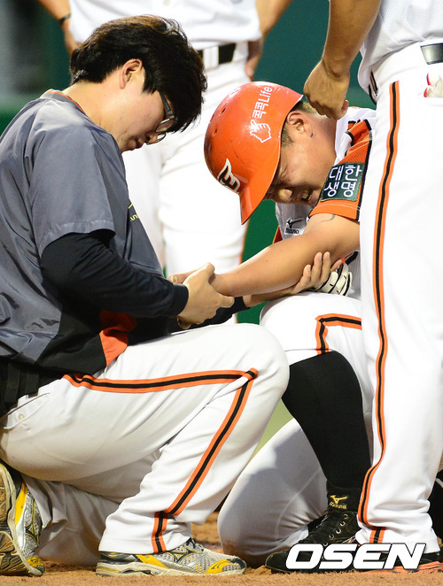 10일 오후 대전 한밭야구장에서 열린 '2012 팔도 프로야구' 한화 이글스와 넥센 히어로즈의 경기, 8회초 1사 1루 넥센 한현희의 공을 맞은 한화 양성우가 고통스러워하고 있다.