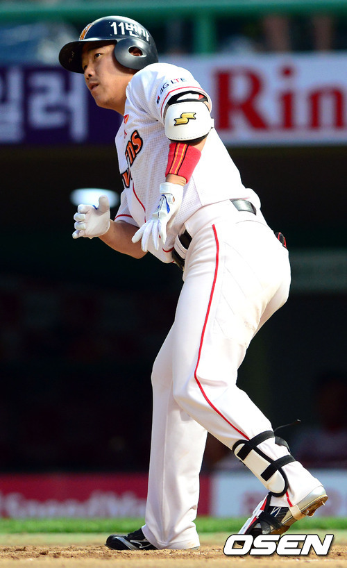 9일 오후 인천 문학구장에서 열린 '2012 팔도 프로야구' SK 와이번스와 삼성 라이온즈의 경기, 8회말 2사 만루 SK 정근우가 자신의 타구를 바라보고 있다.