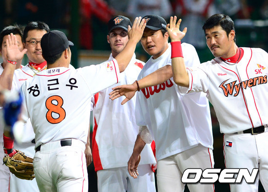 경기 종료후 SK 정근우가 선수들과 기뻐하고 있다. / youngrae@osen.co.kr