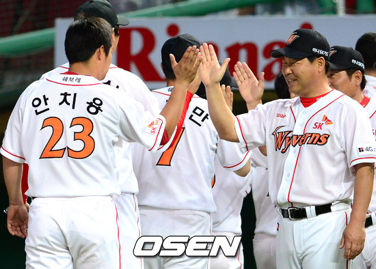 경기 종료 후 SK 이만수 감독과 선수들이 하이파이브를 하고 있다. / youngrae@osen.co.kr