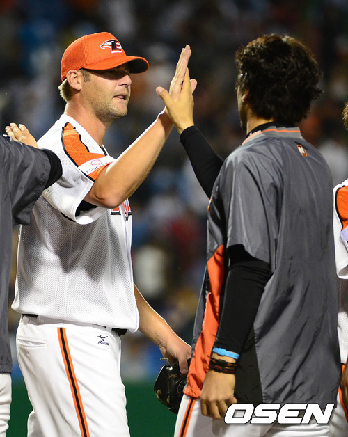 경기 종료 후 한화 박찬호가 션헨과 하이파이브를 하고 있다. / sunday@osen.co.kr