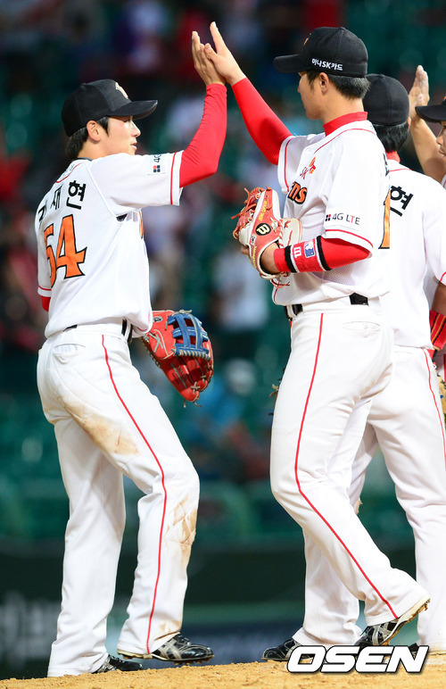 경기 종료 후 SK 김재현과 최정이 하이파이브를 하고 있다. / youngrae@osen.co.kr