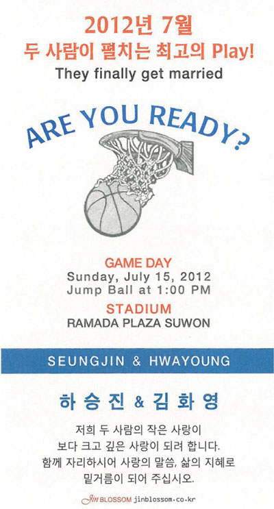 한편 하승진 선수와 신부가 직접 기획한 청첩장은 농구선수의 결혼식임을 한 눈에 알아볼 수 있을 정도로 디자인되어 눈길을 끈다.