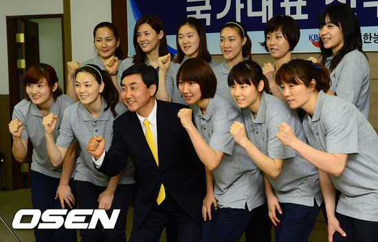 11일 오후 서울 방이동 올림픽파크텔에서 진행된 '2012 런던올림픽 여자농구 국가대표 선수단 결단식'에서 이종걸 대한농구협회장이 대표팀 선수들과 포즈를 취하고 있다
