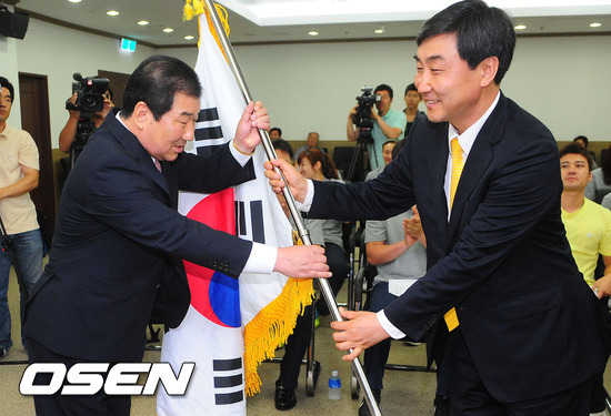 11일 오후 서울 방이동 올림픽파크텔에서 진행된 '2012 런던올림픽 여자농구 국가대표 선수단 결단식'에서 이종걸 대한농구협회장이 박소흠 단장에게 단기를 전달하고 있다