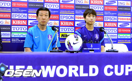 레바논전을 하루 앞둔 11일 오후 경기 고양종합운동장에서 열린 공식기자회견에서 최강희 감독과 이동국이 취재진이 질문을 듣고 있다.