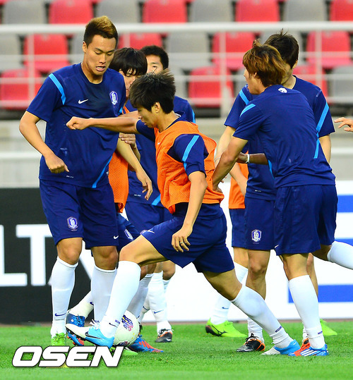 레바논전을 하루 앞둔 11일 오후 경기 고양종합운동장에서 열린 공식훈련에서 이동국과 김신욱이 공을 다투고 있다