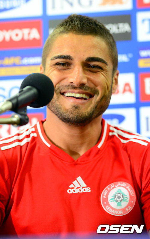 한국전을 하루 앞둔 11일 오후 경기 고양종합운동장에서 열린 공식 기자회견에서 레바논 유세프 모하메드가 미소 짓고 있다