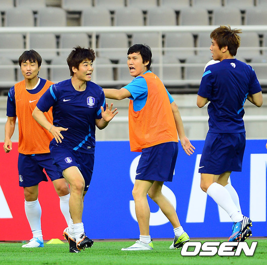 한국전을 하루 앞둔 11일 오후 경기 고양종합운동장에서 열린 공식 훈련에서 기성용이 구자철에게 패스 요구하고 있다