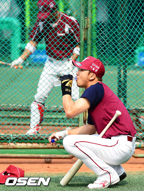 12일 오후 목동구장에서 '2012 팔도 프로야구' 넥센 히어로즈와 KIA 타이거즈의 경기가 열린 예정인 가운데 경기 전 훈련시간에 넥센 이택근이 타격훈련을 기다리며 물을 마시고 있다.