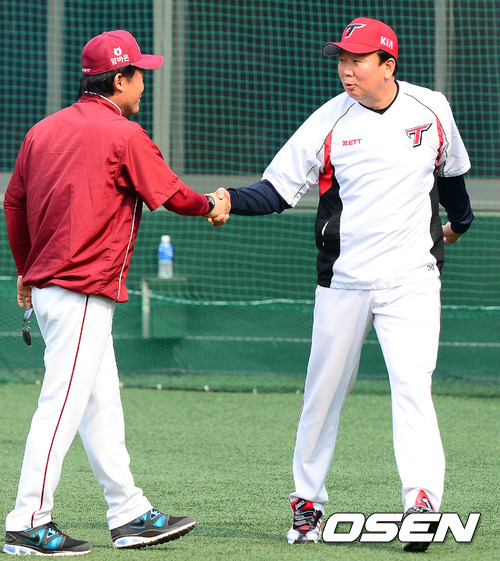 12일 오후 목동구장에서 '2012 팔도 프로야구' 넥센 히어로즈와 KIA 타이거즈의 경기가 열린 예정인 가운데 경기 전 훈련시간에 KIA 선동열 감독이 넥센 박흥식 타격 코치와 악수를 나누고 있다.