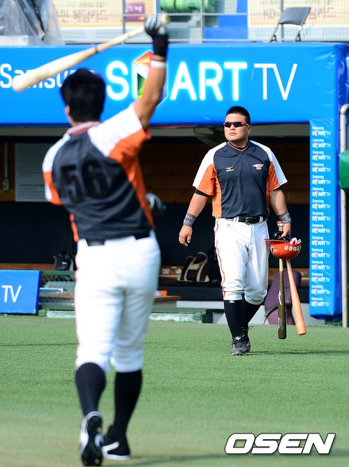 12일 오후 대구 시민구장에서 열리는 '2012 팔도 프로야구' 삼성 라이온즈와 한화 이글스의 경기 시작 전 김태균이 훈련을 하고 있다.