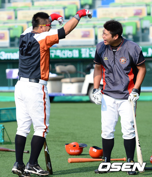 12일 오후 대구 시민구장에서 열리는 '2012 팔도 프로야구' 삼성 라이온즈와 한화 이글스의 경기 시작 전 김태균과 최잰행이 세리머니 제스처를 취하며 장난을 치고 있다.