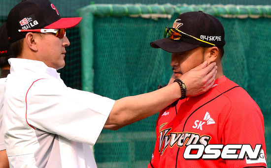 12일 오후 서울 잠실구장에서 열리는 '2012 팔도 프로야구' LG 트윈스와 SK 와이번스의 경기전 LG 김기태 감독이 SK 정경배 코치의 얼굴을 만지며 이야기를 나누고 있다.