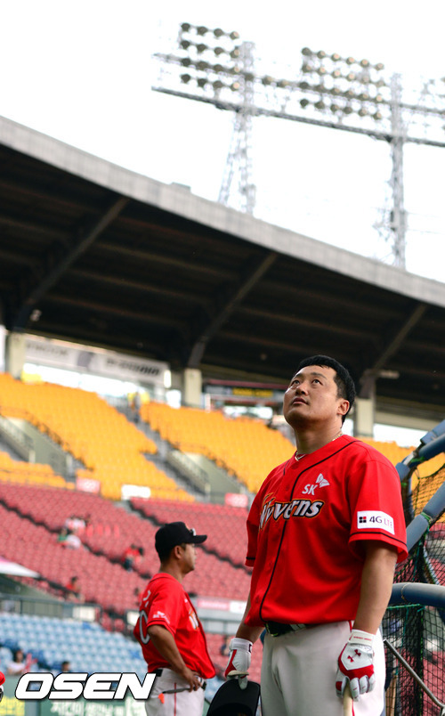12일 오후 서울 잠실구장에서 열리는 '2012 팔도 프로야구' LG 트윈스와 SK 와이번스의 경기전 SK 조인성이 먹구름이 낀 하늘을 바라보고 있다.