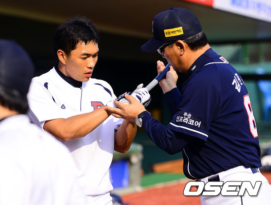 12일 오후 부산 사직구장에서 열리는 2012 팔도 프로야구 롯데 자이언츠와 두산 베어스의 경기 전 두산 김진욱 감독이 이종욱의 타격자세를 교정하고 있다