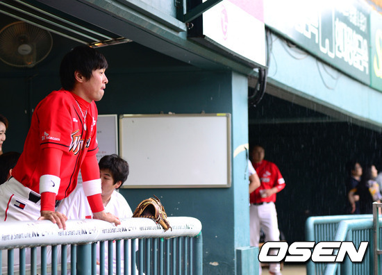 12일 오후 서울 잠실구장에서 열리는 '2012 팔도 프로야구' LG 트윈스와 SK 와이번스의 경기전 SK 임훈이 비를 피해 덕아웃으로 들어와 그라운드를 바라보고 있다.