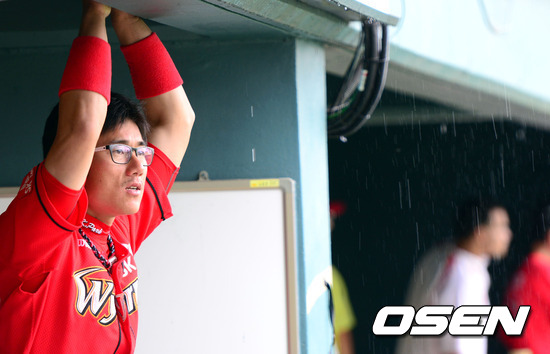 12일 오후 서울 잠실구장에서 열리는 '2012 팔도 프로야구' LG 트윈스와 SK 와이번스의 경기전 SK 박정권이 비를 피해 덕아웃으로 들어와 비가 내리는 그라운드를 바라보고 있다.