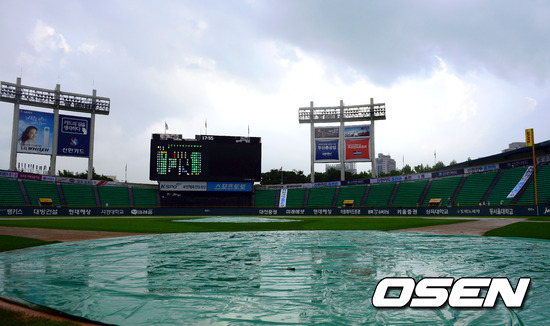 12일 오후 '2012 팔도 프로야구' LG 트윈스와 SK 와이번스의 경기가 열리는 잠실 야구장에 방수포가 덮어져 있다.