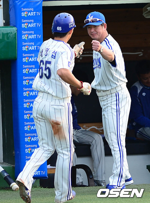 12일 오후 대구 시민구장에서 열린 '2012 팔도 프로야구' 삼성 라이온즈와 한화 이글스의 경기 1회말 1사 3루 박석민의 1타점 적시타에 홈을 밟은 배영섭이 덕아웃에서 류중일 감독과 하이파이브를 하고 있다.