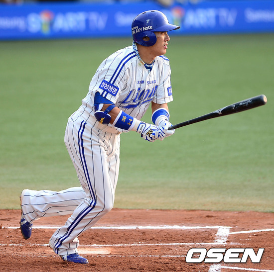 12일 오후 대구 시민구장에서 열린 '2012 팔도 프로야구' 삼성 라이온즈와 한화 이글스의 경기 1회말 1사 1루 이승엽이 우익수 앞 1루타를 치고 있다.