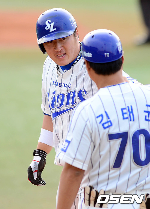 12일 오후 대구 시민구장에서 열린 '2012 팔도 프로야구' 삼성 라이온즈와 한화 이글스의 경기 1회말 2사 2,3루 최형우가 2타점 적시타를 치고 1루에서 김태균 코치와 하이파이브를 하고 있다.