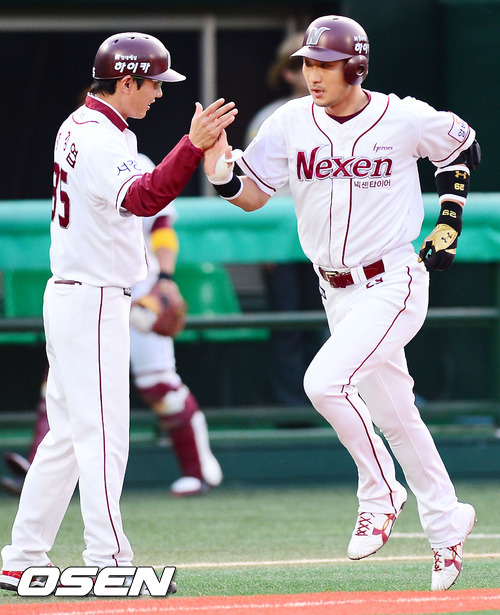 12일 오후 목동구장에서 열린 '2012 팔도 프로야구' 넥센 히어로즈와 KIA 타이거즈의 경기에서 2회말 2사 주자 3루 넥센 이택근이 좌월 투런 홈런을 날린 후 3루에서 염경엽 코치와 하이파이브를 하고 있다.