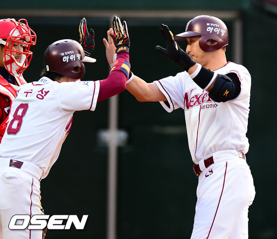 12일 오후 목동구장에서 열린 '2012 팔도 프로야구' 넥센 히어로즈와 KIA 타이거즈의 경기에서 2회말 2사 주자 3루 넥센 이택근이 좌월 투런 홈런을 날린 후 홈에서 선행주자 정수성과 하이파이브를 하고 있다.