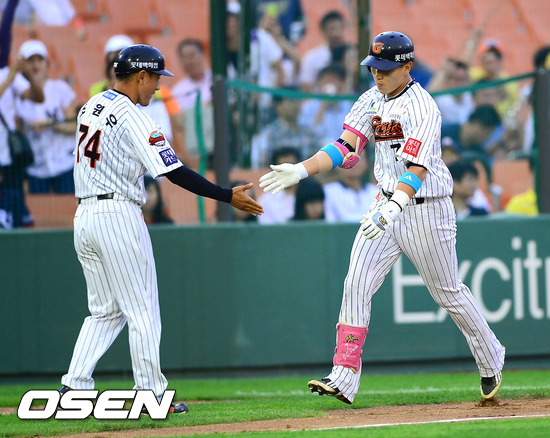 12일 오후 부산 사직구장에서 열린 2012 팔도 프로야구 롯데 자이언츠와 두산 베어스의 경기 2회말 1사 3루 롯데 박준서가 선취 2점 홈런을 날린후 조원우 코치와 하이파이브를 하고 있다