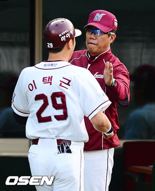 12일 오후 목동구장에서 열린 '2012 팔도 프로야구' 넥센 히어로즈와 KIA 타이거즈의 경기에서 2회말 2사 주자 3루 넥센 이택근이 좌월 투런 홈런을 날린 후 덕아웃에서 김시진 감독과 하이파이브를 하고 있다.