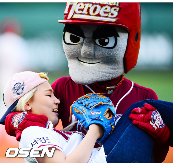12일 오후 목동구장에서 열린 '2012 팔도 프로야구' 넥센 히어로즈와 KIA 타이거즈의 경기에서 가수 알리가 시구를 한 후 턱돌이에게 안겨 퇴장하고 있다.